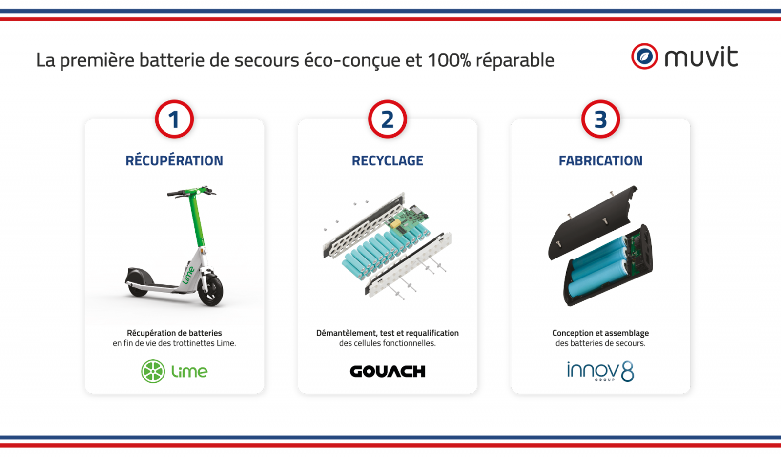 Grâce à cette collaboration, plusieurs milliers de batteries en fin de vie des véhicules partagés de Lime seront récupérées par Gouach, qui recyclera et remettra en état 100% des cellules qu'ils contiennent. Dans ses ateliers de Décines, en Auvergne-Rhône-Alpes, Innov8 utilisera les cellules fournies par Gouach pour fabriquer une nouvelle génération de batteries de secours pour smartphones qui sont conçues de manière écologique, certifiées Made in France et 100% réparables. Ces batteries seront mises en vente sous la marque Muvit au début de 2023 et distribuées via tous les magasins partenaires d'Innov8.